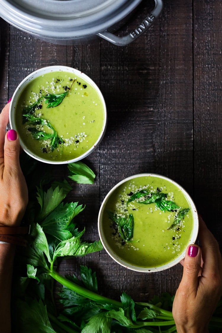 A healing bowl of Celery Soup- comforting, affordable and flavorful, that can be made in  35 minutes. Healthy, delicious and vegan adaptable!