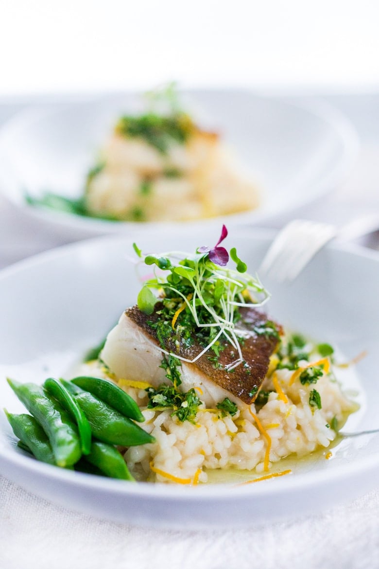 A delicious recipe for Meyer lemon risotto topped with seared white fish and drizzled with a flavorful lemon herb sauce, called gremolata.