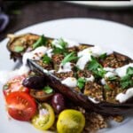 This Middle Eastern roasted eggplant is baked until tender with za’atar, then served over rice with a creamy tahini yogurt sauce, tomatoes, herbs, and Greek olives. Vegan, gluten-free, video.