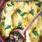This Vegan Shepherds Pie recipe is made with a savory mushroom and root vegetable filling, topped with creamy, pillowy mashed potatoes. Vegan-adaptable.Â