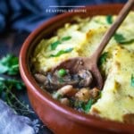 This vegan shepherd’s pie recipe is so cozy and comforting! Savory mushrooms, root vegetables, and white beans are bathed in a flavorful gravy and topped with creamy, pillowy mashed potatoes and baked until golden. Vegan-adaptable. Video.