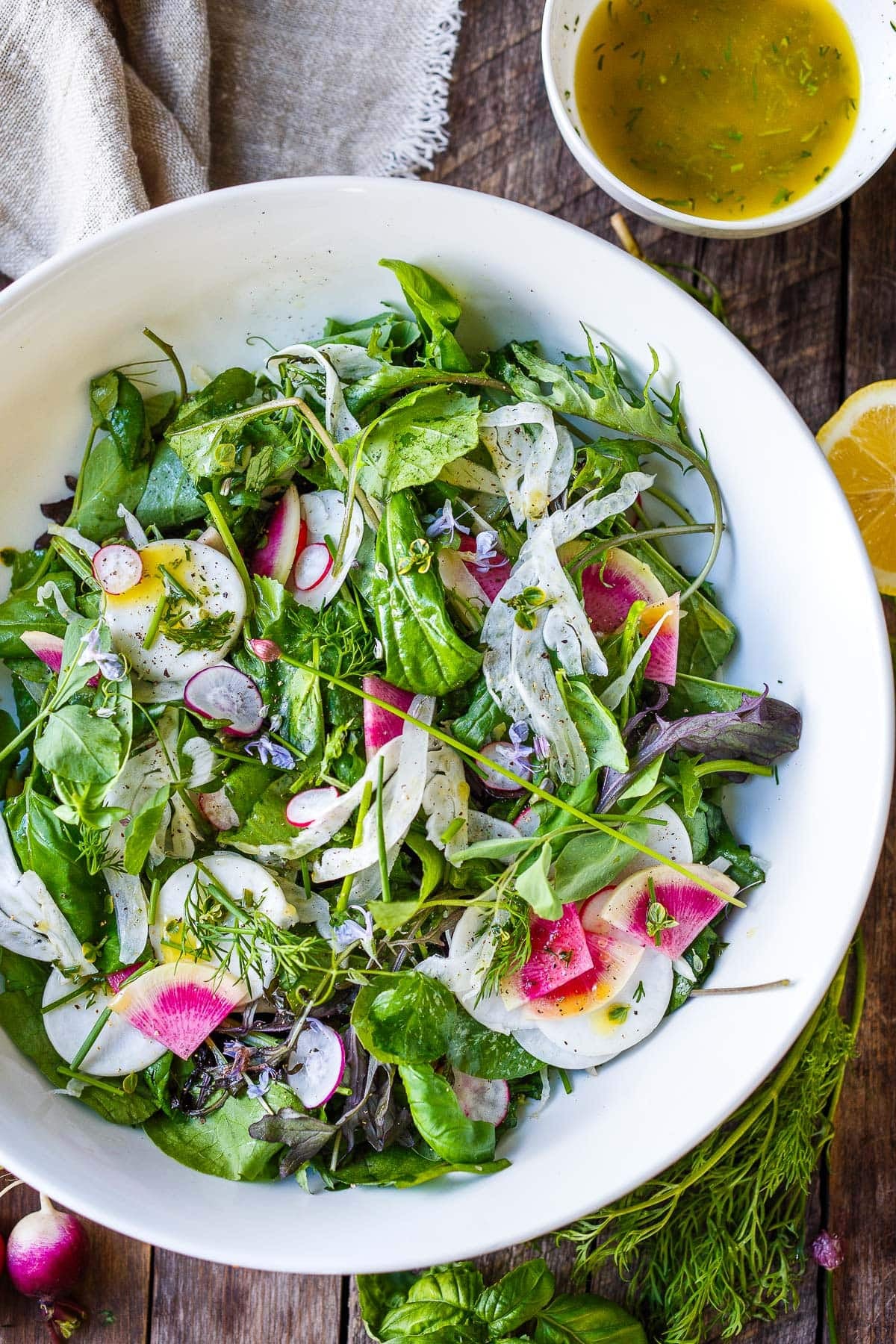 Simple, herby, and delicious, this spring salad recipe is made with tender spring greens, fresh herbs, shaved fennel, and radishes tossed in a lemon dressing