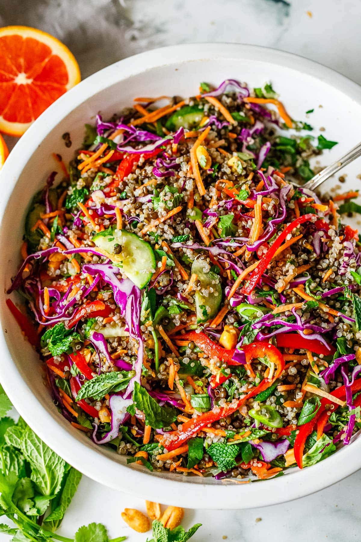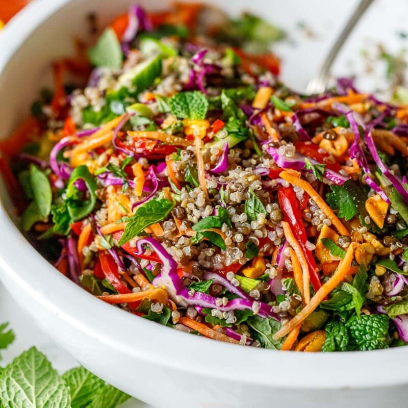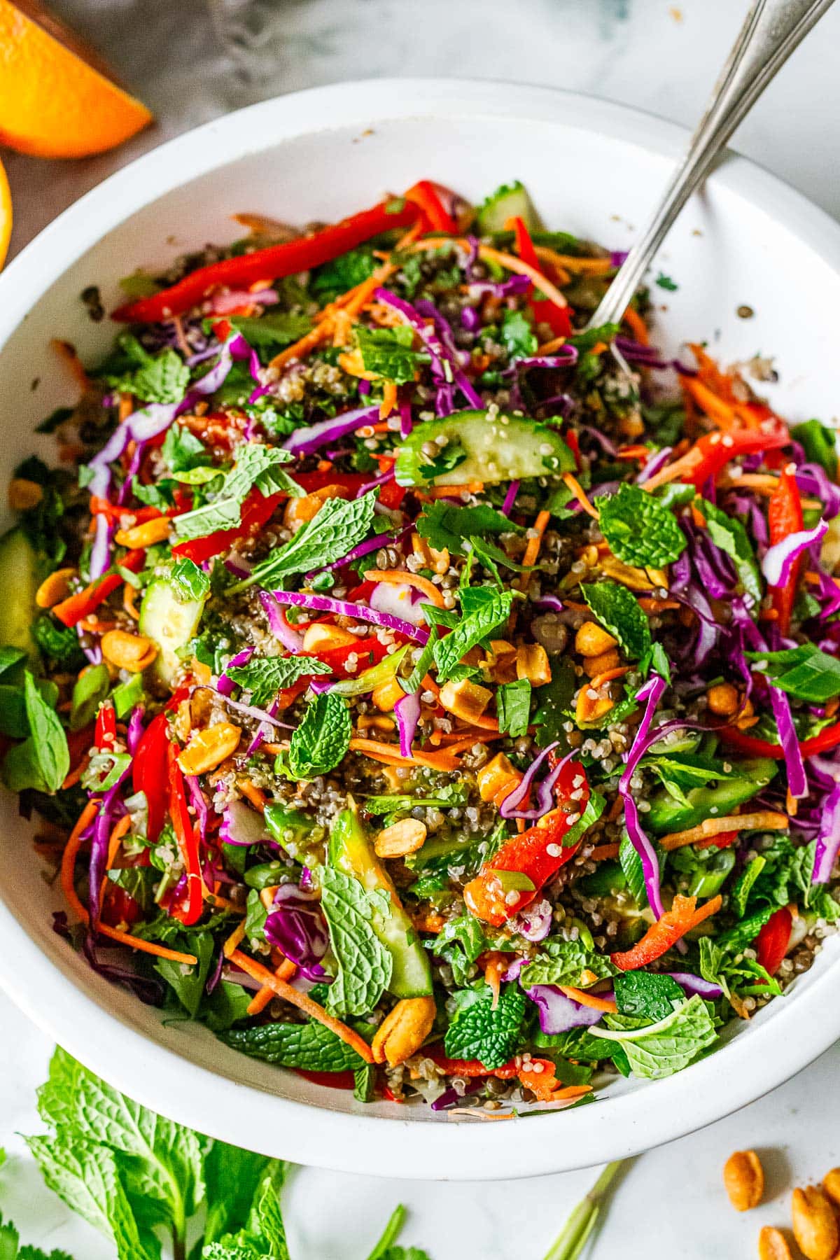 This bright and cheery Thai Quinoa Salad is packed with Thai flavor! Crunchy veggies, quinoa, lentils, and fragrant herbs in a tangy Thai Dressing. Vegan & gluten-free. Video.